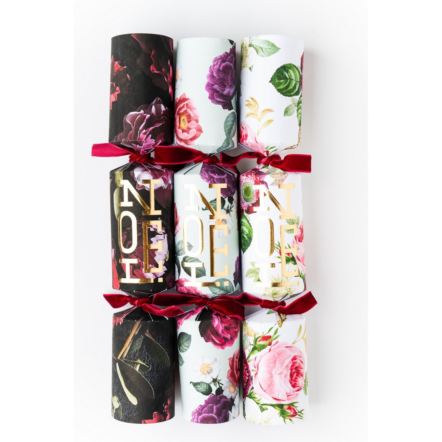 Take your cracker game to the next level with this set of Luxury Rich Florals. Designed with romantic, full blown roses on white, each bonbon is printed with the word Noel in gold. They’re tied with deep red bows. Cue All I Want For Christmas Is You by Mariah Carey.