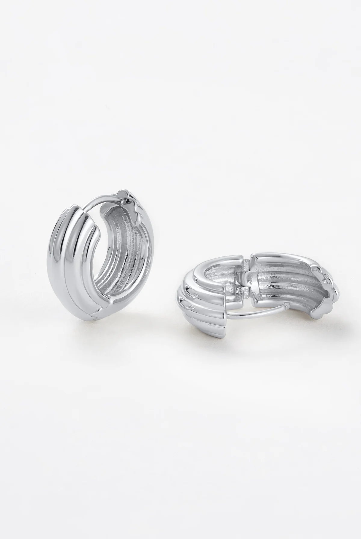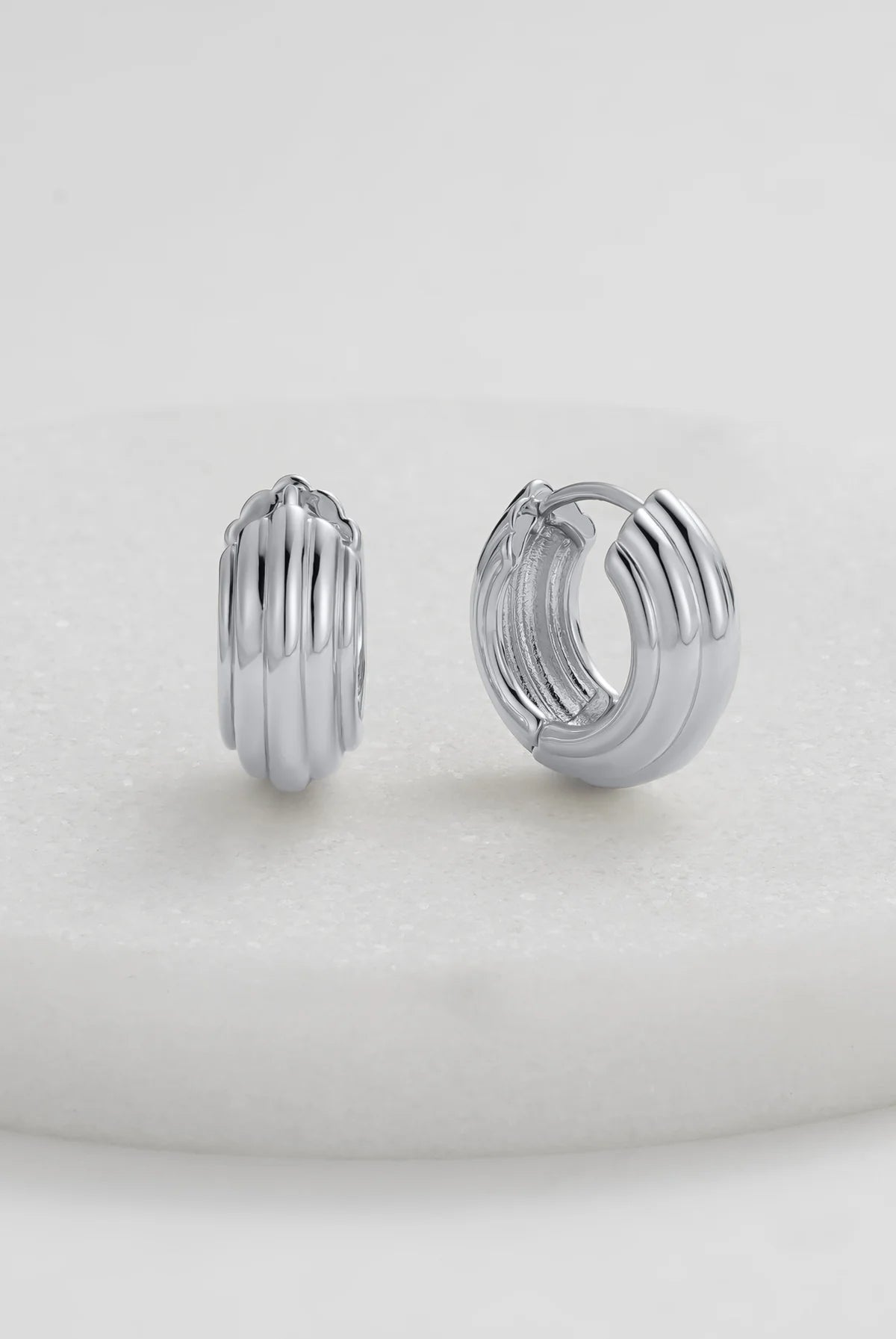 A delicate yet distinctive piece featuring a unique ridge design. This small hoop is perfect for effortless styling, whether worn alone or stacked for a curated ear look. Designed to complement our Paris Hoops.