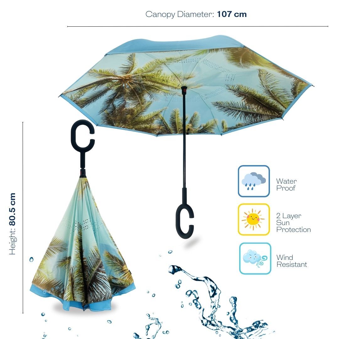 Every opening is a revelation with the IOco Island Paradise Upside Down Umbrella. Imagine lounging under a canopy of lush palm leaves, the sky a brilliant canvas of blue, captured right beneath your umbrella. This Reverse Umbrella doesn’t just protect you from the rain; it invites you to a personal paradise where every day is sunny and every sky is blue.