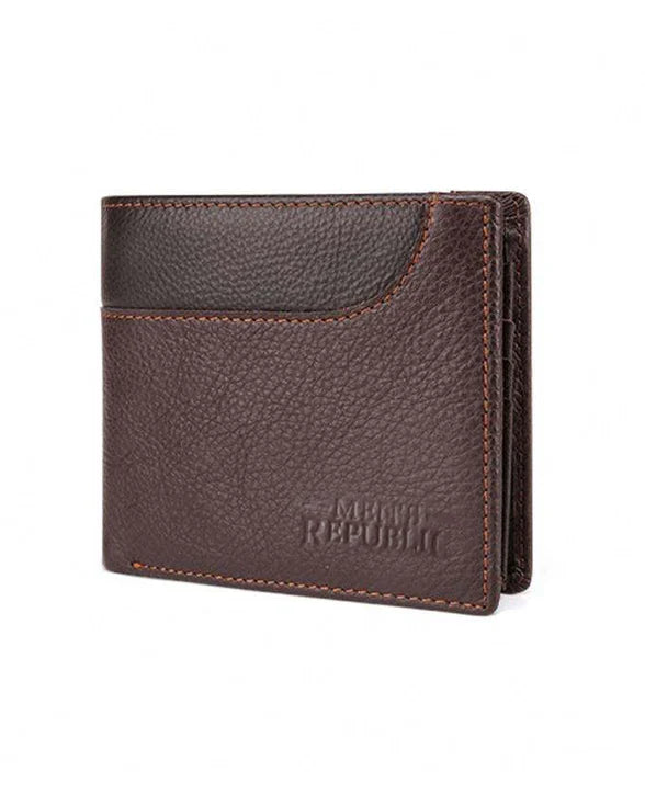 This Men's Republic Leather Bifold Wallet is a sophisticated essential accessory, crafted from genuine leather with RFID protection. Elevate your everyday style with this timeless and classic accessory that combines durability and luxury. Comes in a coffee colourway.