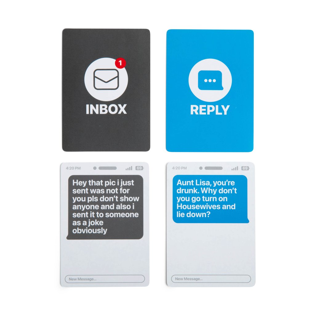 Similar in basic play pattern to our #1 best selling game What Do You Meme?®, players rotate drawing a card — in this case a sent (or “inbox”) card while the rest of the group competes to play the funniest reply card.