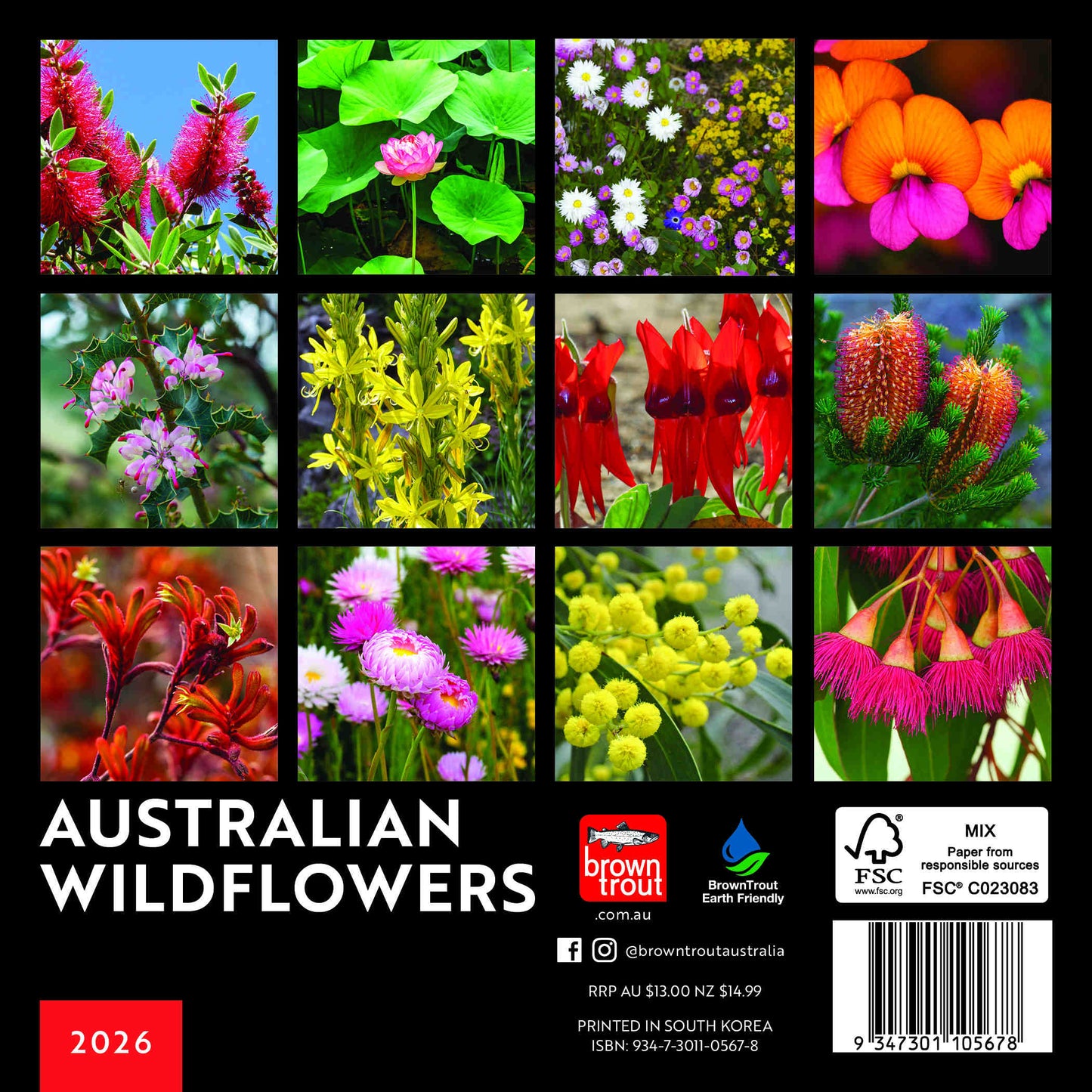 This calendars features a collection of beautiful native Australian Wildflowers.The 178 x 178mm (178 x 356mm open) saddle stitched mini square format wall calendar comes shrink wrapped with a cardboard stiffener to decrease the risk of damage in transit when sending to friends and family. Drill hole included so you can hang the calendar on your wall.Includes International, National and Regional Australian and New Zealand Public Holidays and other important dates, Australian and New Zealand school term dates and 2027 At-A-Glance dates. Each month displays a mini datepad as reference to the previous and next months, southern hemisphere moon phases, space for daily entries and additional notes and image captions throughout. This is a 12 month calendar - January to December 2026.Printed on 250gsm gloss art stock for cover and 150gsm gloss art stock for internal pages.BrownTrout honours its commitment to sustainability by choosing FSC certified paper, soy and vegetable based inks and a digital workflow and to ensuring ethical trade manufacturing standards.