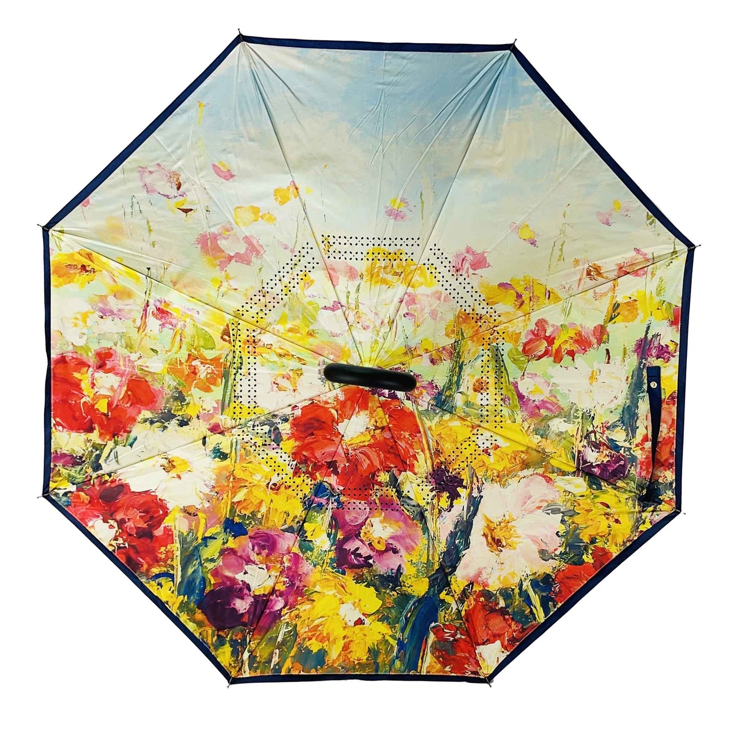 Step into a vibrant field of colour with the Festival of Flowers Reverse Umbrella from IOco’s celebrated Art Series collection. The underside of this inverted umbrella bursts with expressive brushstrokes and rich floral tones — reds, yellows, pinks, and purples blooming wildly under a soft blue sky. It’s like carrying a canvas of celebration above your head.