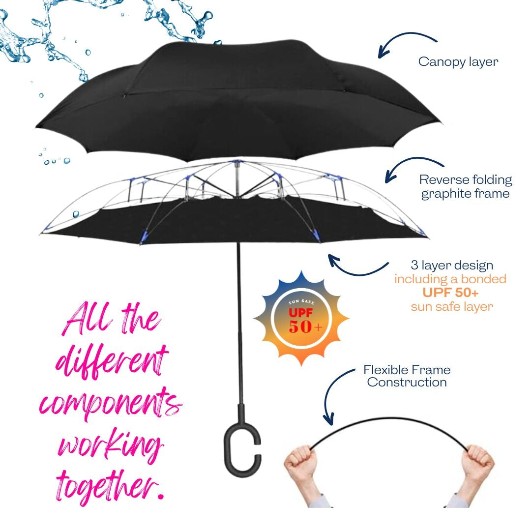 More than just beautiful, this upside down umbrellaprotects you from the harsh Australian sun. The third fused layer provides UPF 50+ protection, blocking 98% of UVA and UVB rays — keeping you shaded and safe in any weather.