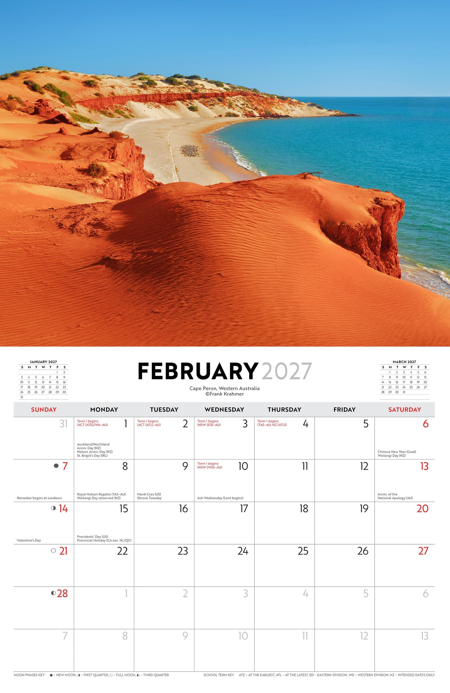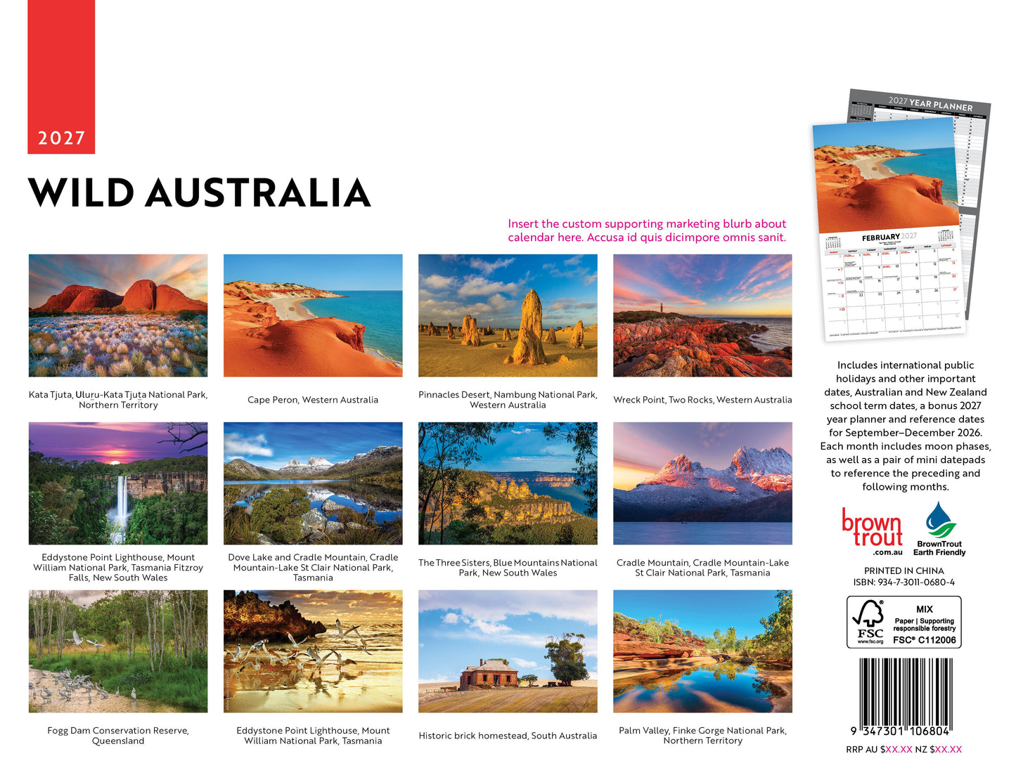 Some of Australia's most remarkable and untouched landscapes are showcased in this calendar. The 318 x 245mm (305 x 490mm open) saddle stitched horizontal/landscape format wall calendar comes with a cardboard stiffener to decrease the risk of damage in transit. Includes a drill hole so that you can hang the calendar on your wall. Includes International, Australian and New Zealand Public Holidays and other important dates, School term dates for Australia and New Zealand and a bonus 2027 Year Planner. Each month displays a mini datepad as reference to the previous and next months, southern hemisphere moon phases and image captions throughout. This is a 12 month calendar - January to December 2027. Printed on 250gsm gloss art stock for cover and 150gsm gloss art stock for internal pages. BrownTrout honours its commitment to sustainability by choosing Plastic Free packaging, FSC certified paper, soy and vegetable based inks and a digital workflow and to ensuring ethical trade manufacturing standards.