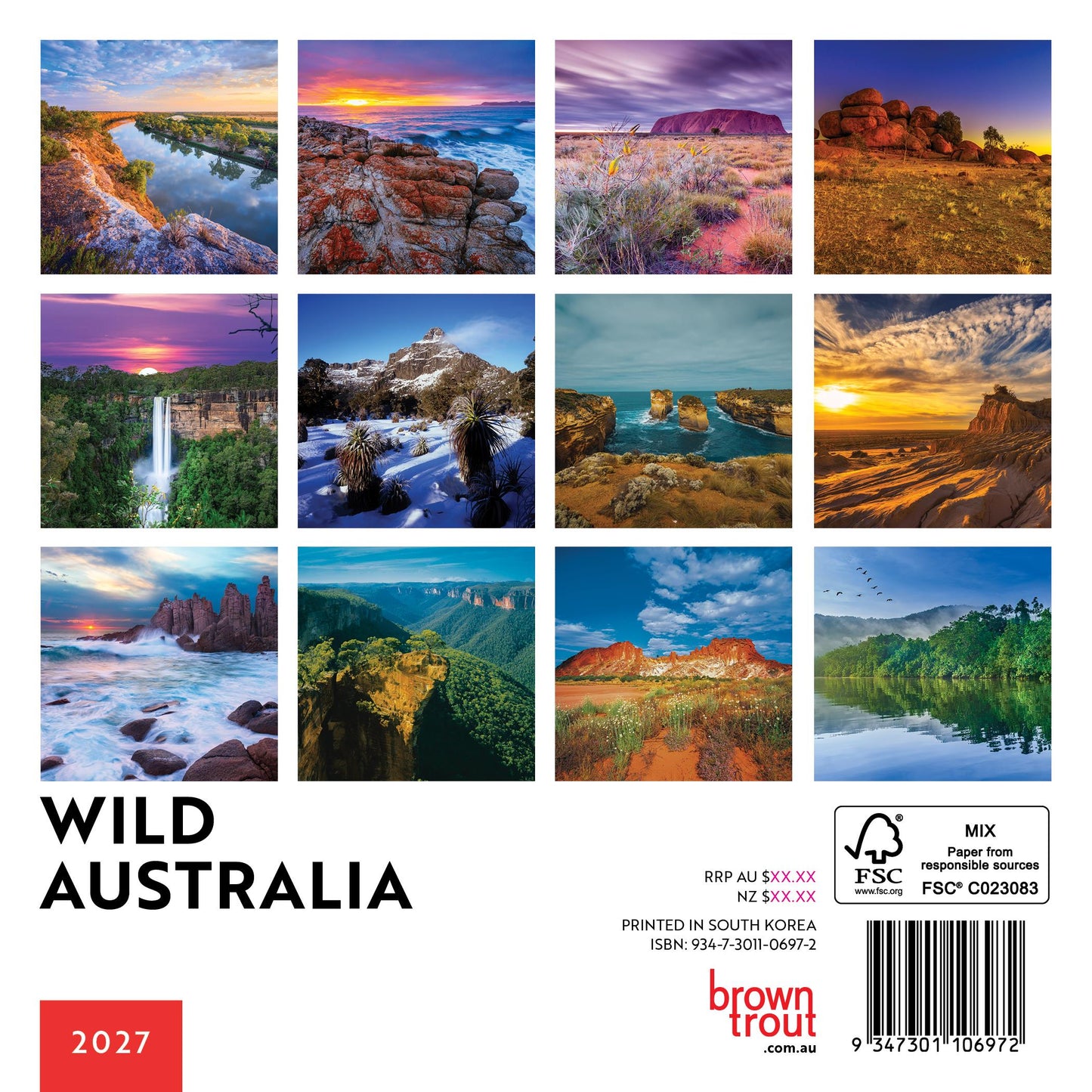Amazing images from Australia's wild landscapes. The 178 x 178mm (178 x 356mm open) saddle stitched mini square format wall calendar comes with a cardboard stiffener to decrease the risk of damage in transit when sending to friends and family. Drill hole included so you can hang the calendar on your wall. Includes International, National and Regional Australian and New Zealand Public Holidays and other important dates, Australian and New Zealand school term dates and 2027 At-A-Glance dates. Each month displays a mini datepad as reference to the previous and next months, southern hemisphere moon phases, space for daily entries and additional notes and image captions throughout. This is a 12 month calendar - January to December 2027. Printed on 250gsm gloss art stock for cover and 150gsm gloss art stock for internal pages. BrownTrout honours its commitment to sustainability by choosing sturdy Plastic Free packaging, FSC certified paper, soy and vegetable based inks and a digital workflow and to ensuring ethical trade manufacturing standards.